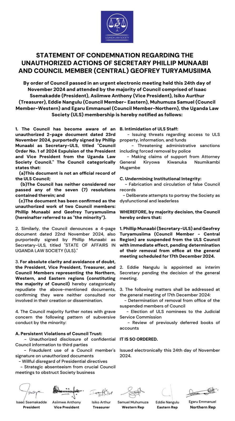 Then, over the weekend, ULS secretary, Phillip Munaabi, purported to expel Ssemakadde and the ULS vice president, citing problems with their ‘decorum’ and other issues, including the use of ‘vulgar and condescending language’. Munaabi said this caused ‘tremendous damage’ to the ULS.